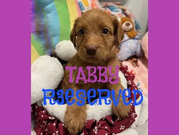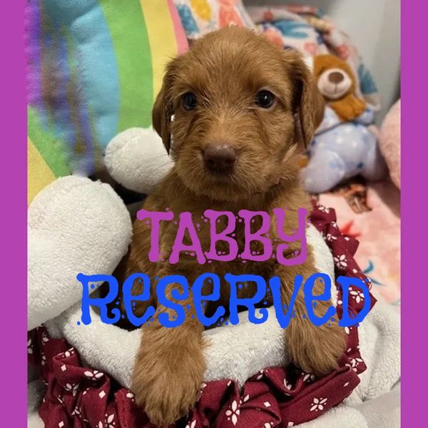 Meet Tabby, She was born on 7/10/25 and she is a very cute and cuddly female Golden F1B Labradoodle. Her parents are a Mila and Duke. Mila is a 50 lb. F1 Labradoodle and Duke is a 45 lb. AKC registered Chocolate Moyen Poodle. She is expected to be 45-55 pounds full grown... and is sure to melt your heart with lots of puppy kisses and snuggling.