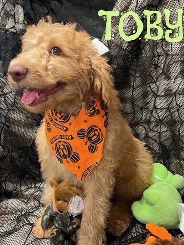 His parents are a Mila and Duke. Mila is a 50 lb. F1 Labradoodle and Duke is a 45 lb. AKC registered Chocolate Moyen Poodle. Toby is expected to be