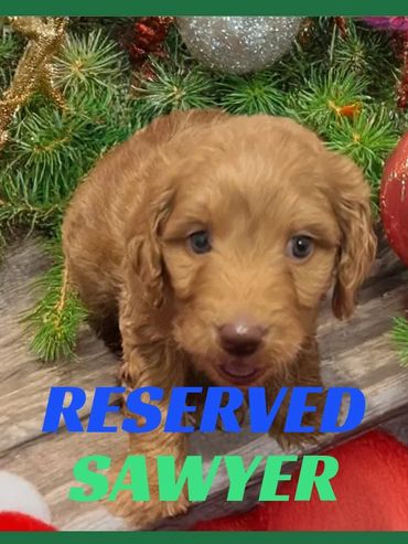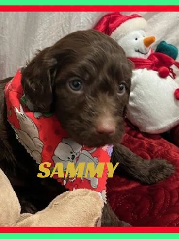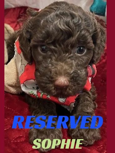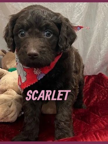 Hello there, I am Scarlet, I was born on 11/12/25 and I am a female Chocolate, Mini Goldendoodle. My parents are Coco, a 35 lb. Goldendoodle and Duke, a 45lb. AKC registered Moyen Poodle. I expect I will be 35-45 pounds full grown... and I will be sure to melt your heart with lots of love and playtime.