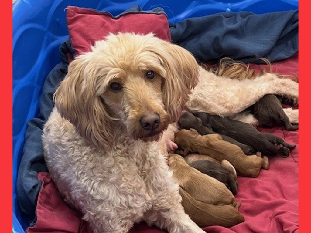a Mini Goldendoodle and Duke, an AKC registered Moyen Poodle. Mom is 35 pounds and Dad is 45 pounds. I expect I will be 35-45 pounds full grown. I will be sure to melt your heart with lots of Lovin and puppy smooches.