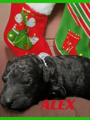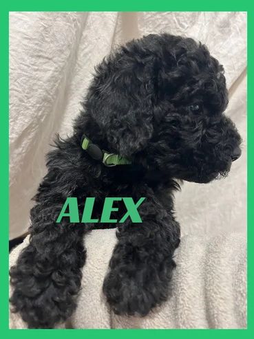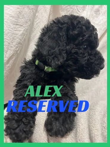 Meet Alex, He was born on 11/28/25 and is a very cute and cuddly Male Black Moyen Poodle. His parents are Roxy and Duke. Roxy is a 40 lb. Small Standard Poodle and Duke is a 40 lb. AKC registered Chocolate Moyen Poodle. He is expected to be 35-45 pounds full grown... and is sure to melt your heart with lots of puppy kisses and snuggling.