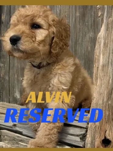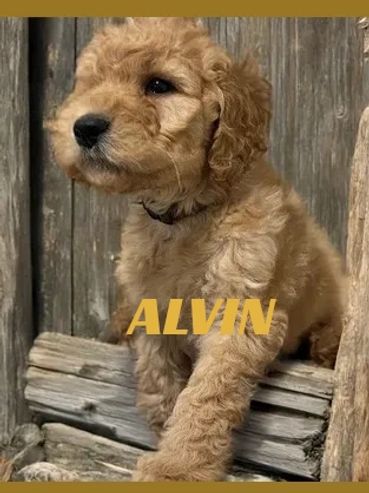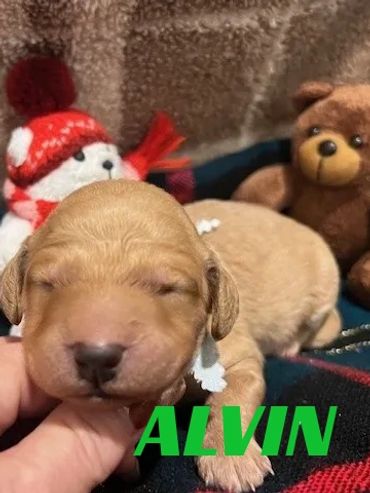 Hi, I am Alvin, I was born on 11/28/25 and I am a happy and healthy male Golden Moyen Poodle. My parents are Roxy, a small standard white Poodle and Duke, an AKC registered Moyen Poodle (Pictured above). Mom is 40 pounds and Dad is 35 pounds. I expect I will be 35-45 pounds full grown. I will be sure to melt your heart with lots of puppy kisses and snuggling.