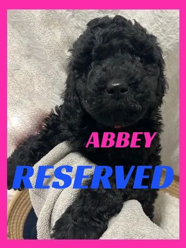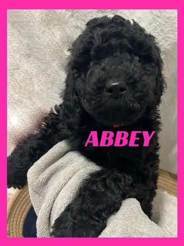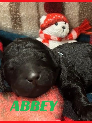 Hi, I am Abbey, I was born on 11/28/25 and I am a happy and healthy female Black Moyen Poodle. My parents are Roxy, a small standard white Poodle and Duke, an AKC registered Moyen Poodle (Pictured above). Mom is 40 pounds and Dad is 35 pounds. I expect I will be 35-45 pounds full grown. I will be sure to melt your heart with lots of puppy kisses and snuggling.